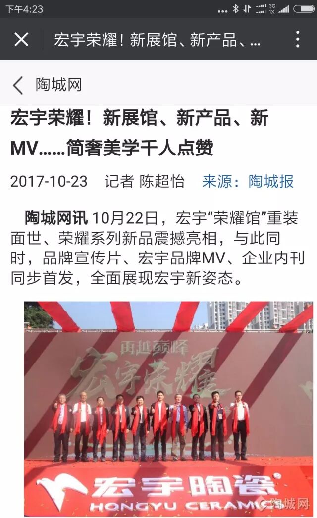 宏宇陶瓷,譽滿中華。祝創新前行的宏宇陶瓷,持金色理想,樹百年品牌,贏萬家滿意!——陶瓷信息報社總編輯 周建盛