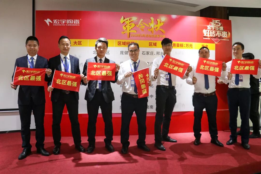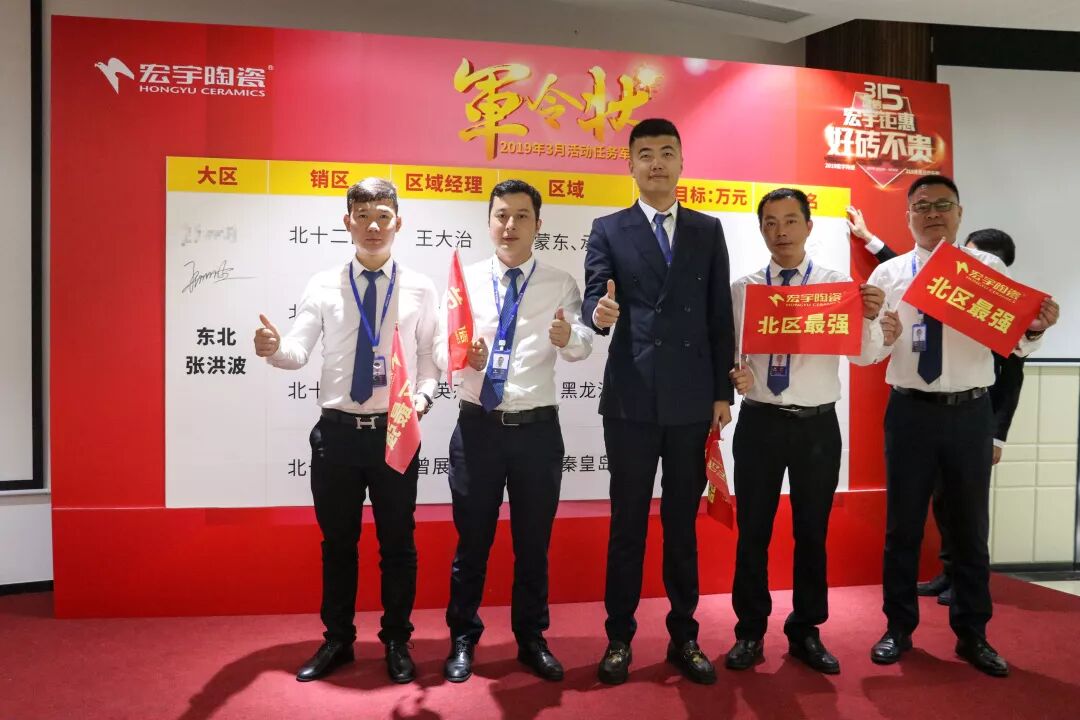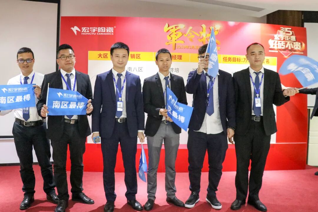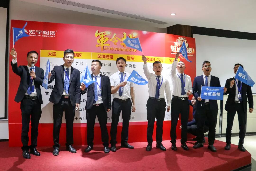 “北區最強!”、“南區最棒!”、“華南區最牛!”一聲聲震耳欲聾的吶喊聲、歡呼聲使整個會場熱血沸騰,升溫不斷。宏宇銷售鐵軍紛紛簽下軍令狀,并將以超越自我,突破極限,努力拼搏的精神,創造宏宇陶瓷新巔峰!