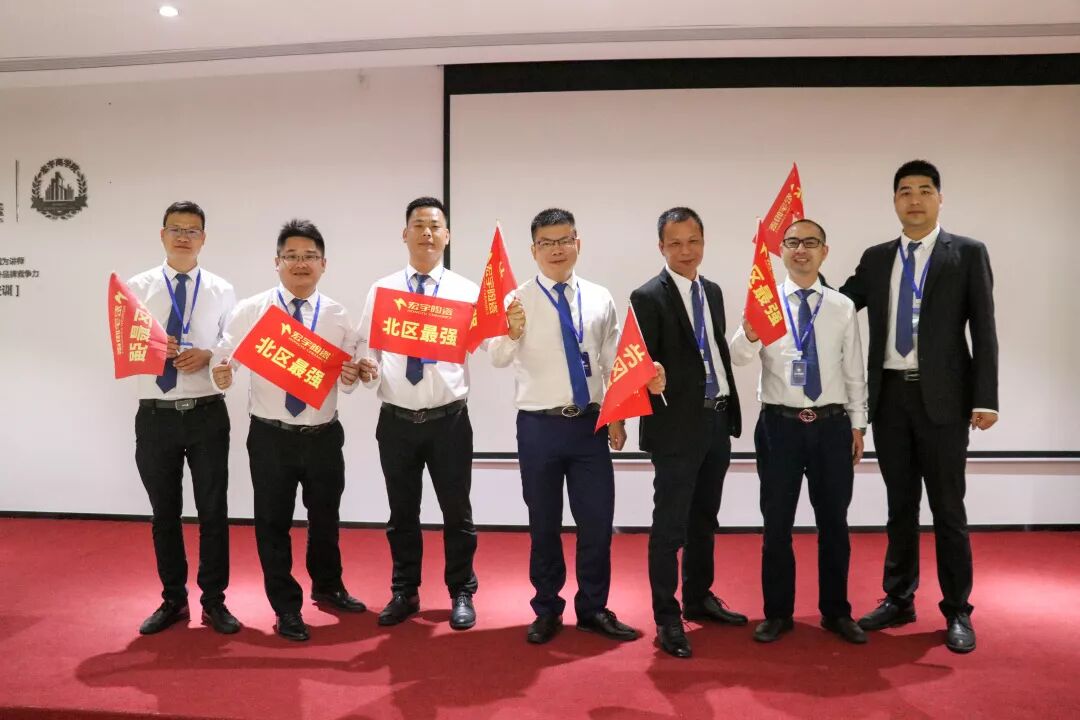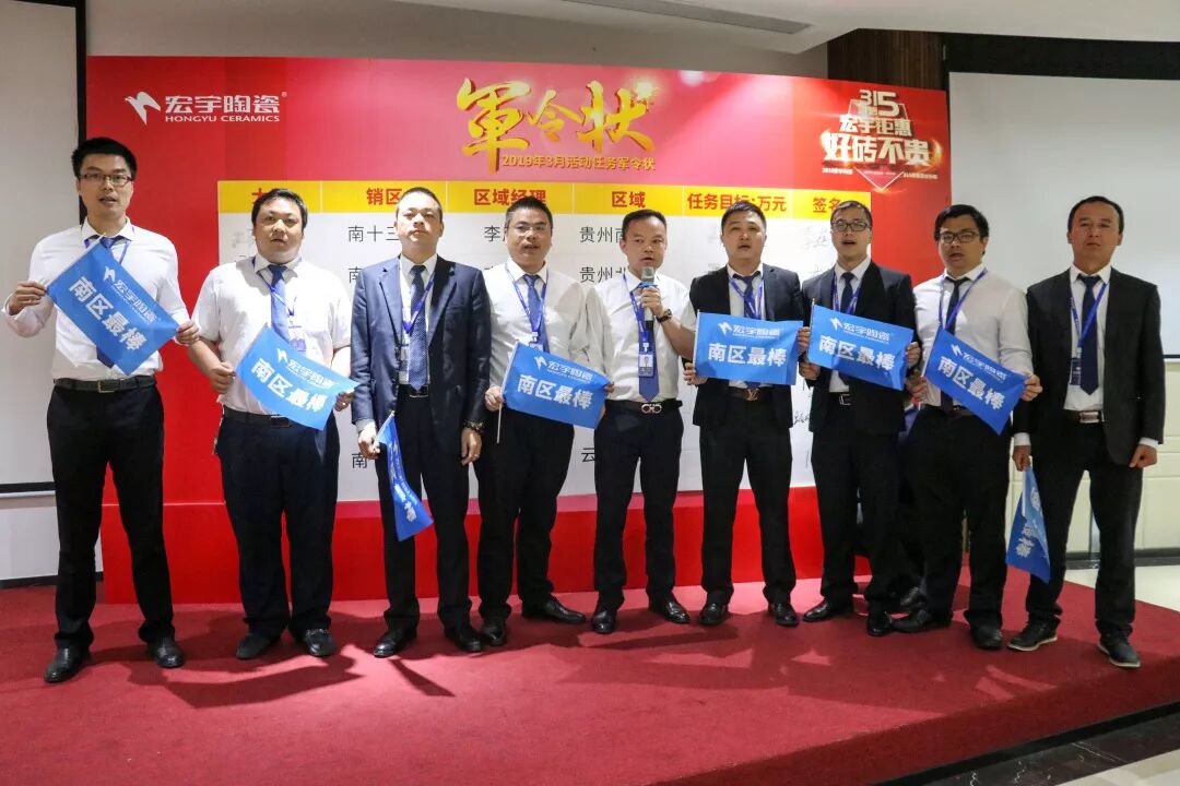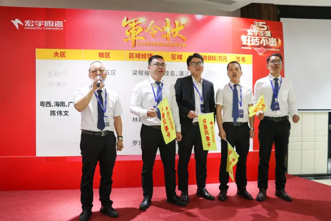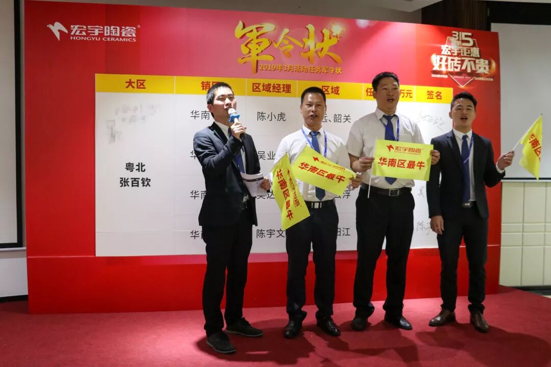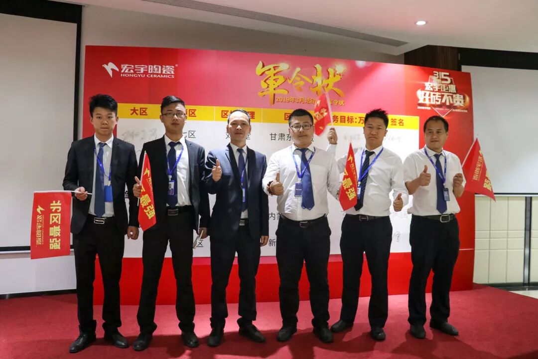 “北區最強!”、“南區最棒!”、“華南區最牛!”一聲聲震耳欲聾的吶喊聲、歡呼聲使整個會場熱血沸騰,升溫不斷。宏宇銷售鐵軍紛紛簽下軍令狀,并將以超越自我,突破極限,努力拼搏的精神,創造宏宇陶瓷新巔峰!