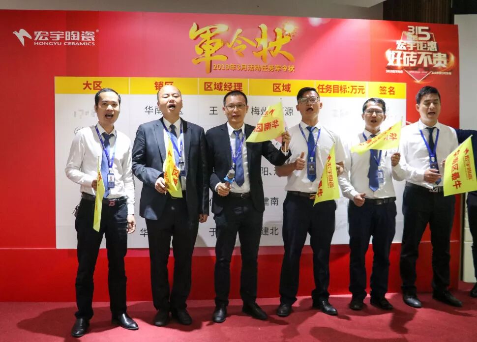 東風吹,戰鼓擂;戰鼓聲聲催人進,旌旗獵獵踏征程。新春伊始,宏宇陶瓷總部鐵軍壯志躊躇,豪情會師,豪邁吹響315開年大戰集結號,正式拉開2019年全國聯動促銷戰役的序幕。