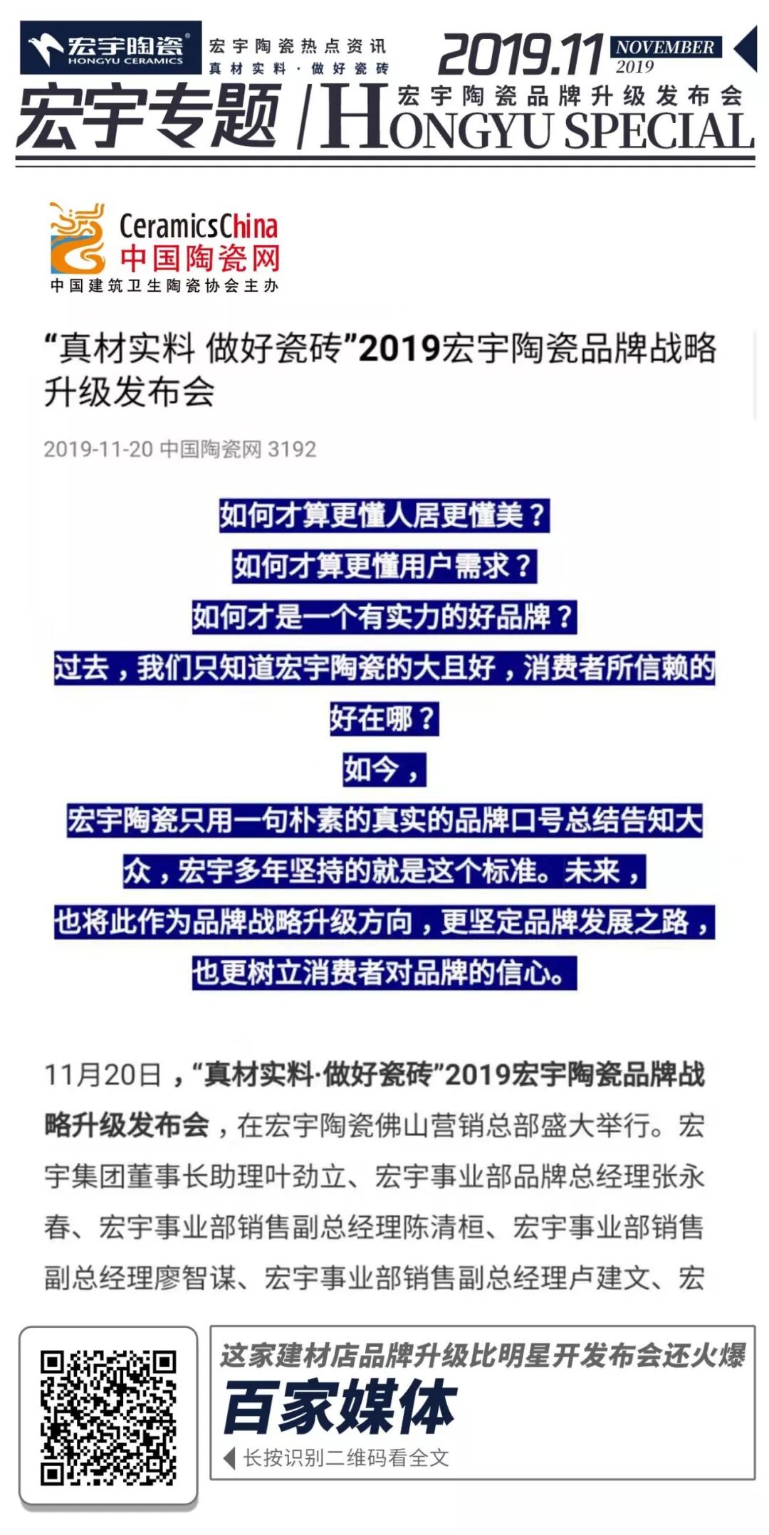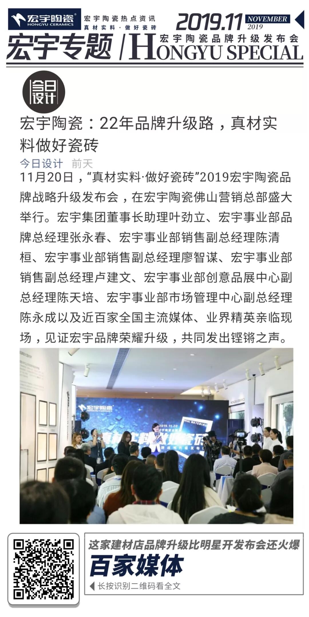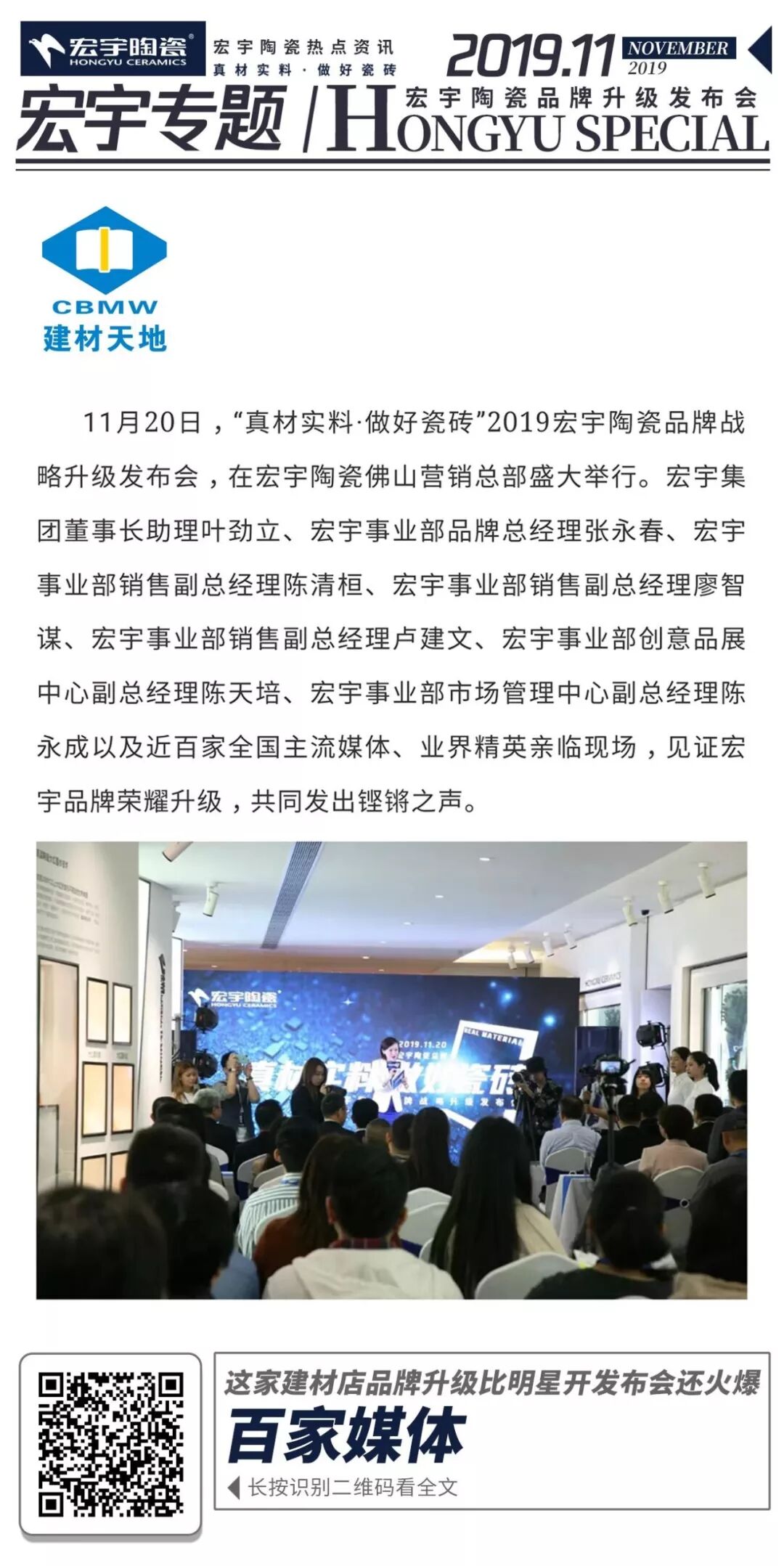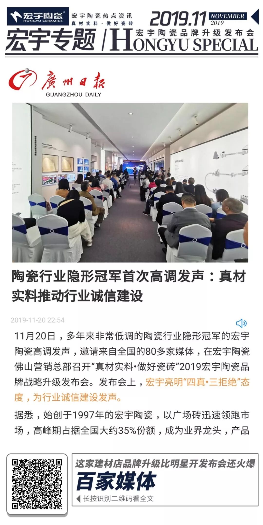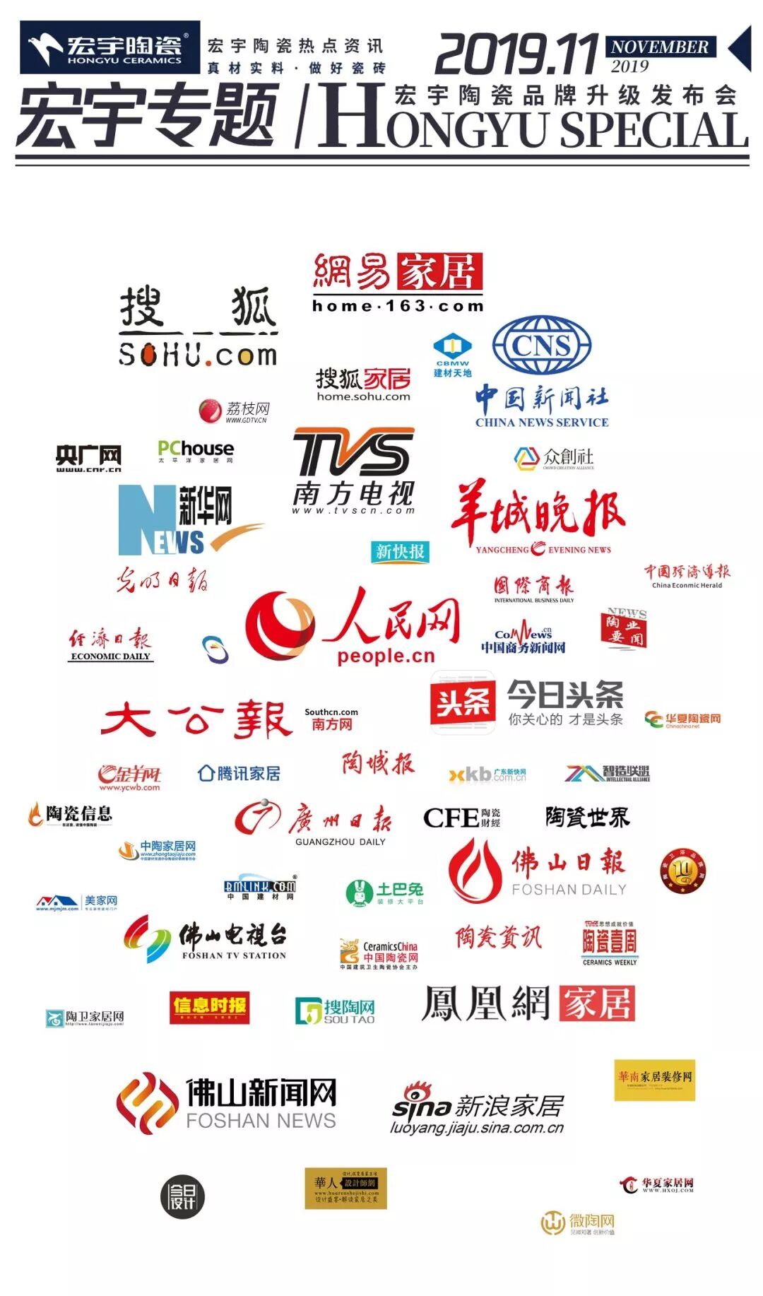 11月20日,“真材實料·做好瓷磚”2019宏宇陶瓷品牌戰略升級發布會在宏宇陶瓷佛山營銷總部盛大舉行。光明日報、中新社、新華網、經濟日報、人民網、中央廣播電視總臺央廣新媒體、國際商報、中國經濟導報、南方衛視、羊城晚報、香港大公報、南方網、新快報、信息時報、搜狐網等近百家重量級主流媒體及行業媒體到場,共同見證宏宇品牌榮耀升級。當天盛況迅速在業內刮起“宏宇旋風”,引發大量媒體爭相報道!