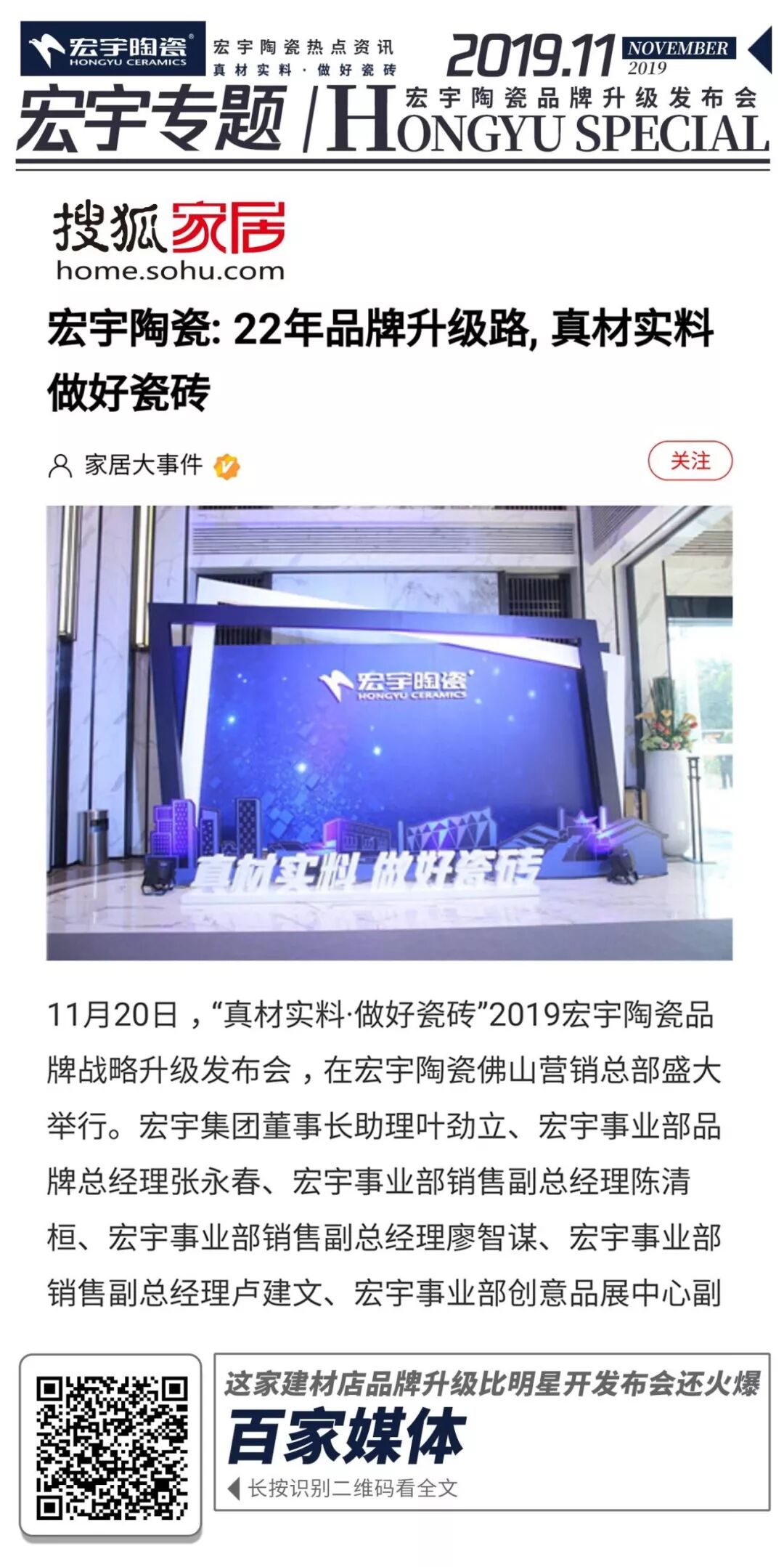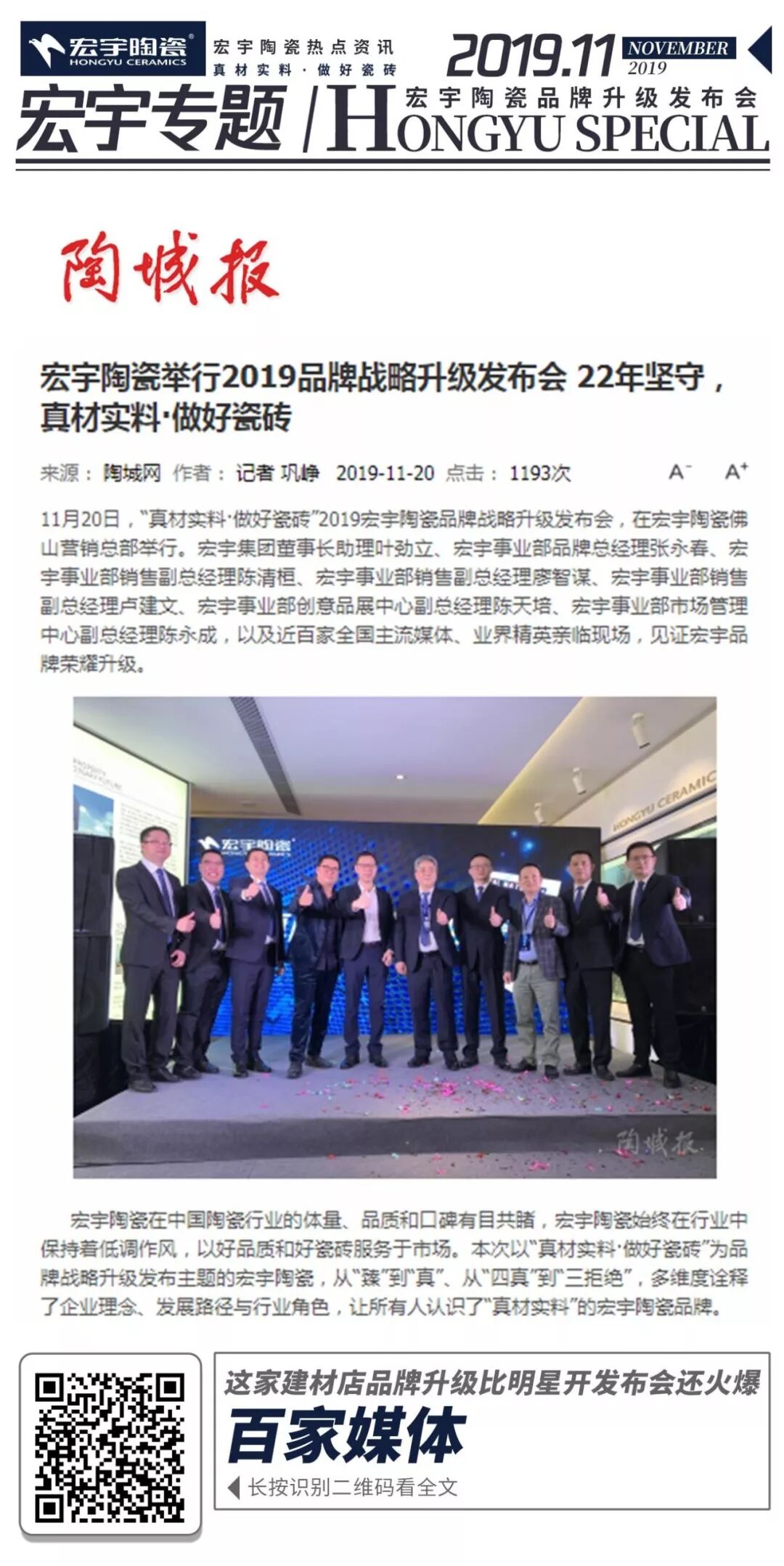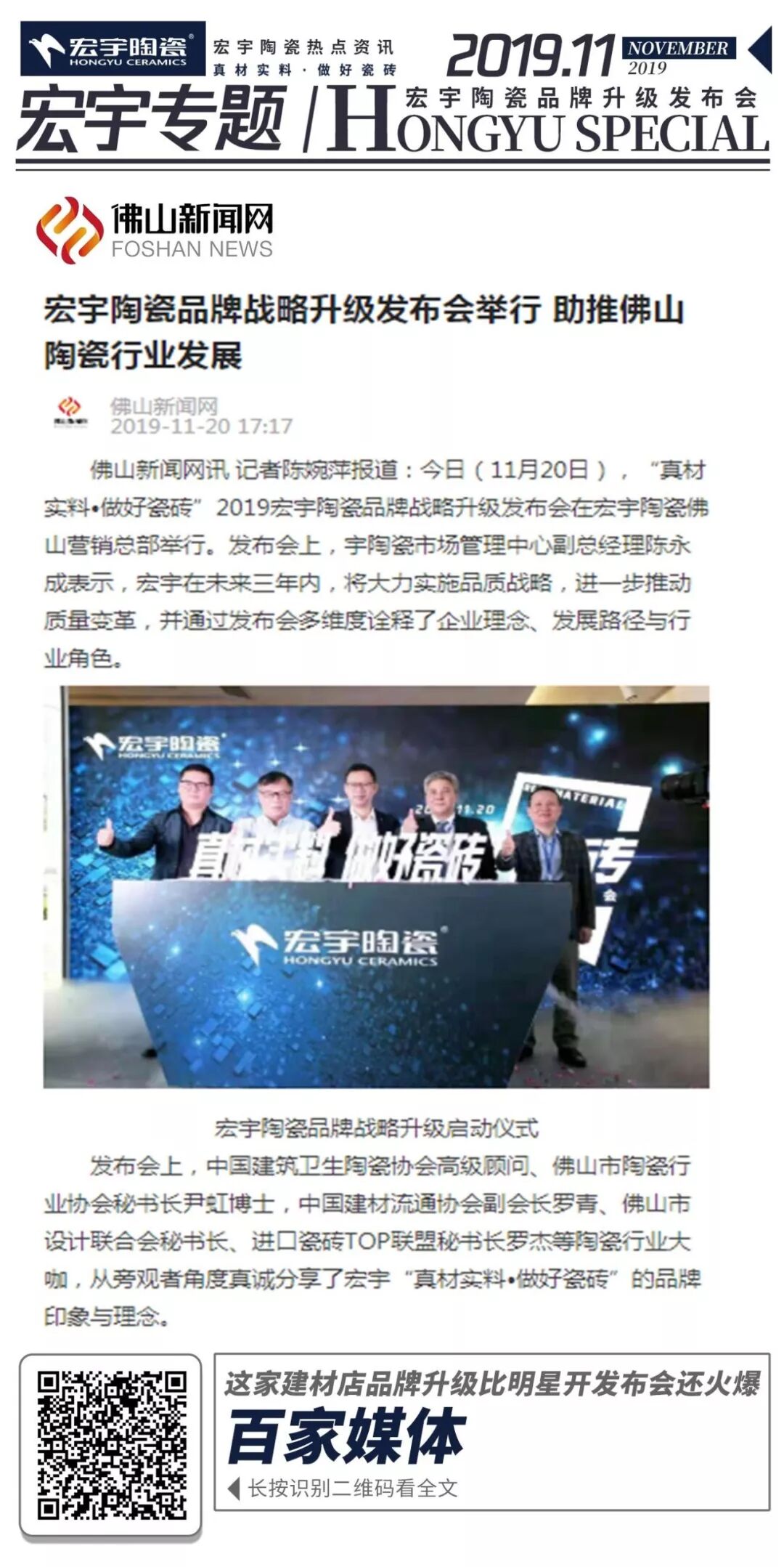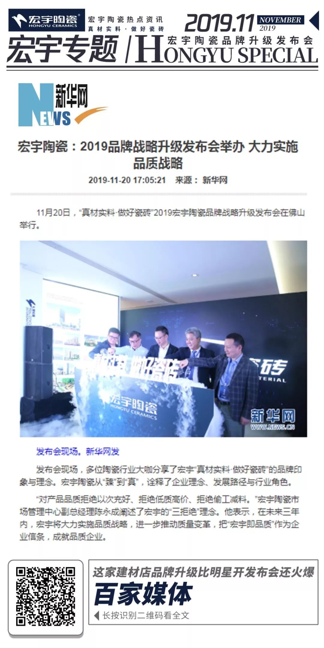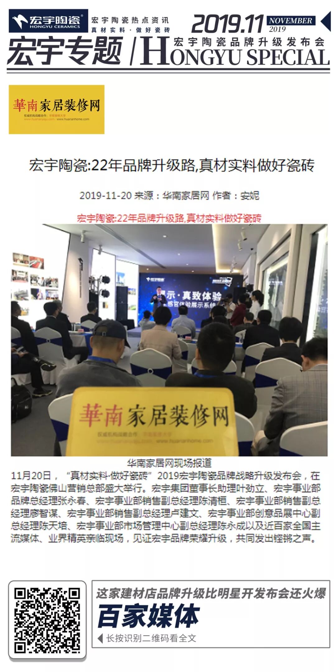 11月20日,“真材實料·做好瓷磚”2019宏宇陶瓷品牌戰略升級發布會在宏宇陶瓷佛山營銷總部盛大舉行。光明日報、中新社、新華網、經濟日報、人民網、中央廣播電視總臺央廣新媒體、國際商報、中國經濟導報、南方衛視、羊城晚報、香港大公報、南方網、新快報、信息時報、搜狐網等近百家重量級主流媒體及行業媒體到場,共同見證宏宇品牌榮耀升級。當天盛況迅速在業內刮起“宏宇旋風”,引發大量媒體爭相報道!
