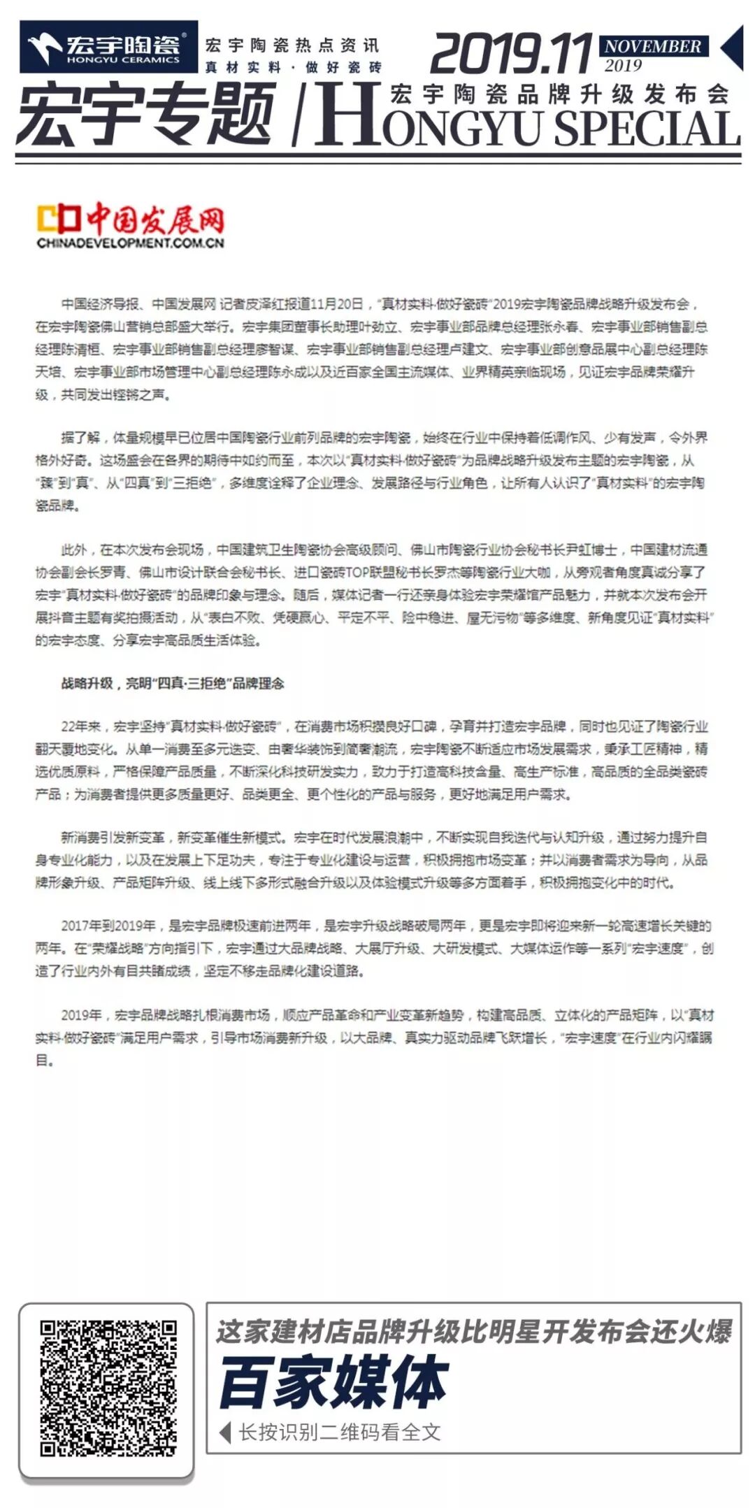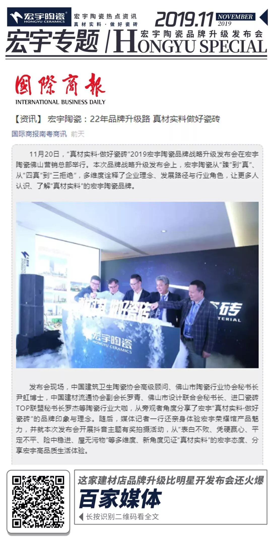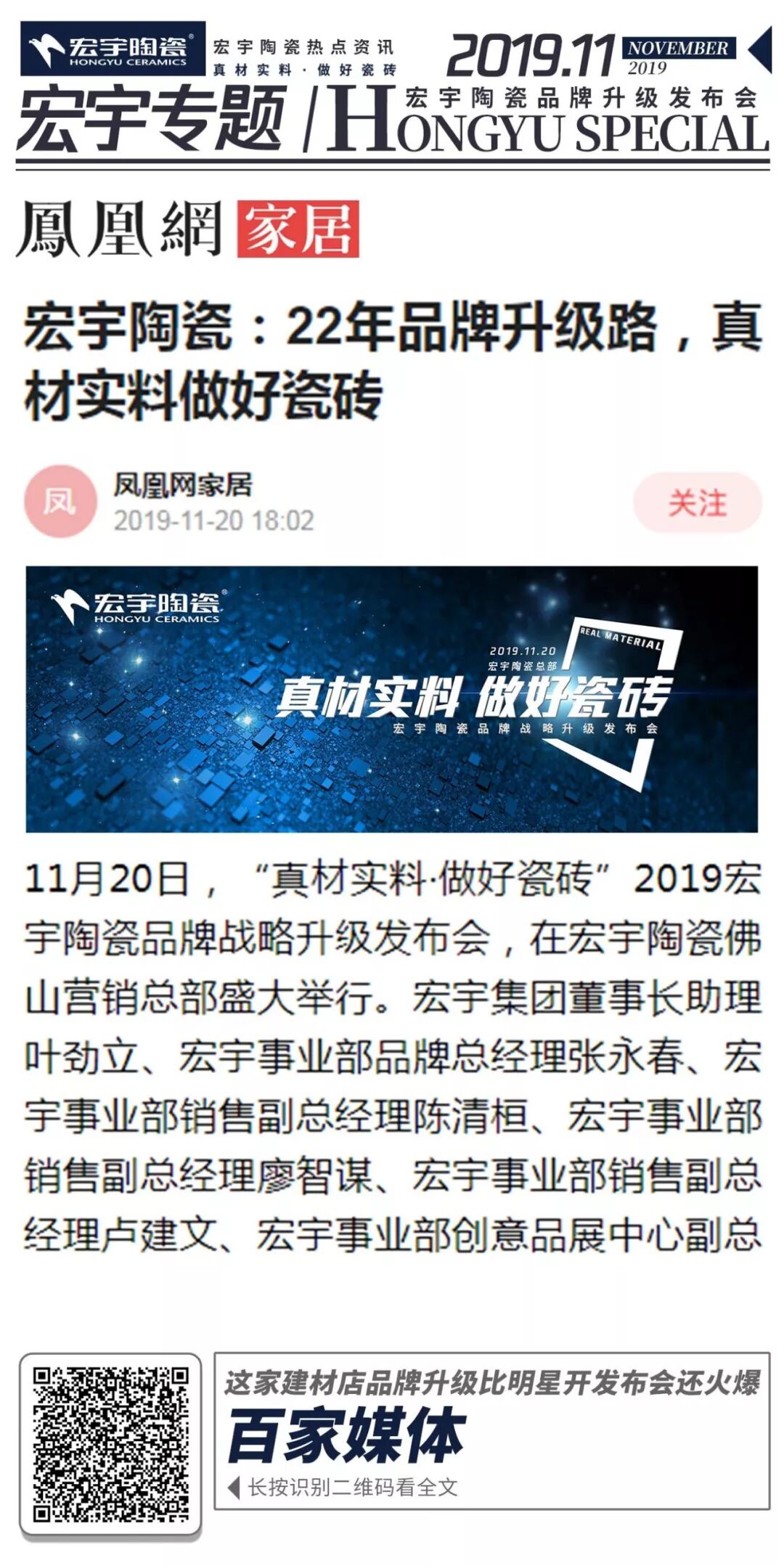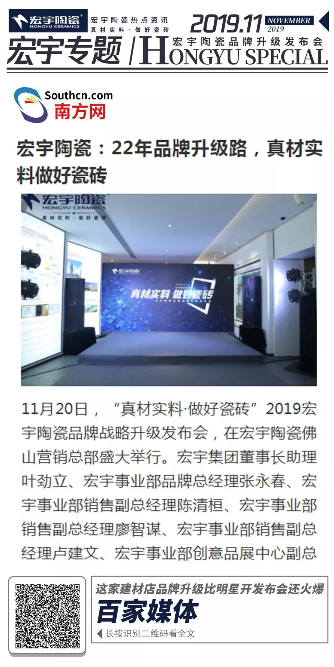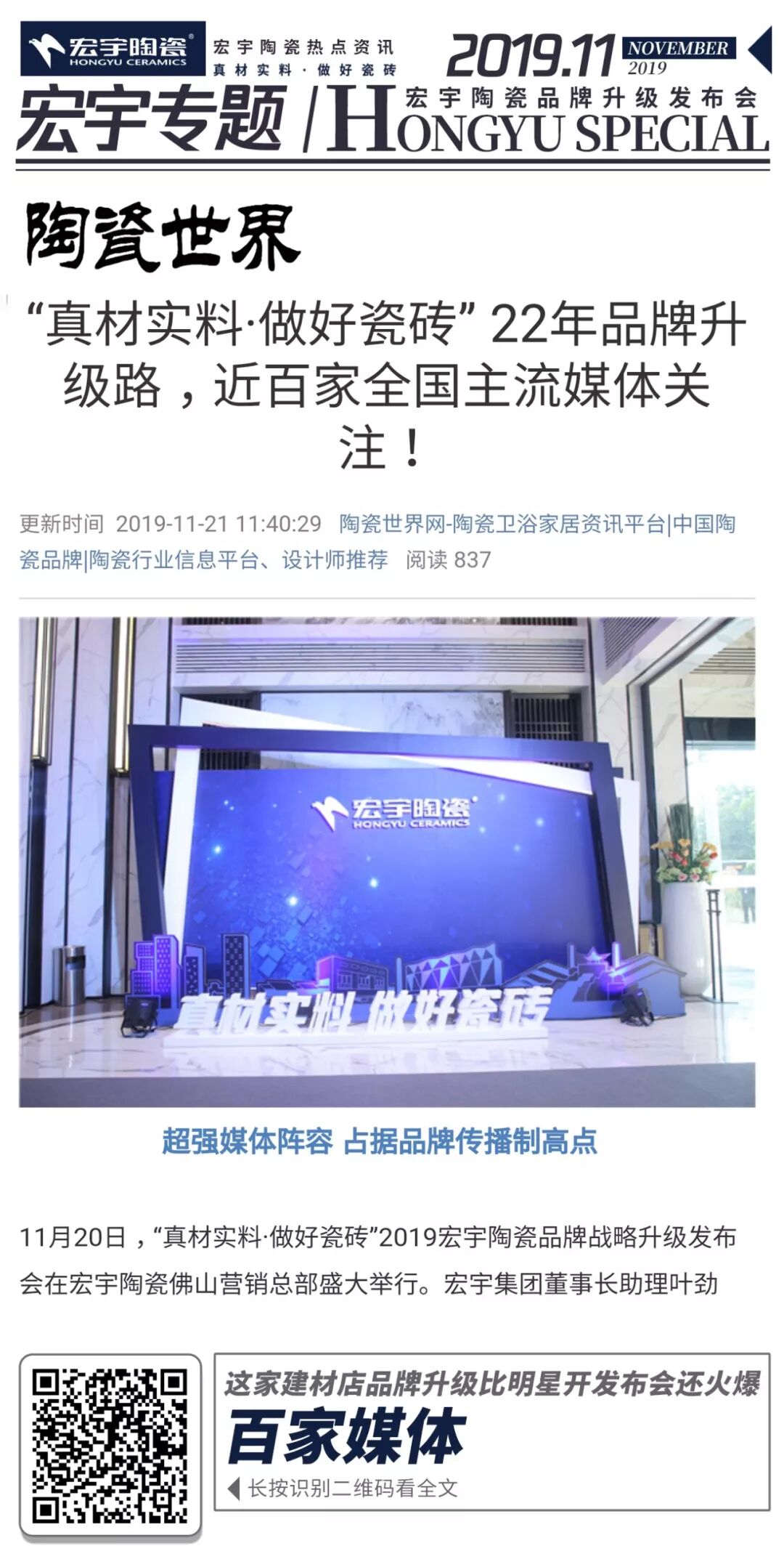 11月20日,“真材實料·做好瓷磚”2019宏宇陶瓷品牌戰略升級發布會在宏宇陶瓷佛山營銷總部盛大舉行。光明日報、中新社、新華網、經濟日報、人民網、中央廣播電視總臺央廣新媒體、國際商報、中國經濟導報、南方衛視、羊城晚報、香港大公報、南方網、新快報、信息時報、搜狐網等近百家重量級主流媒體及行業媒體到場,共同見證宏宇品牌榮耀升級。當天盛況迅速在業內刮起“宏宇旋風”,引發大量媒體爭相報道!