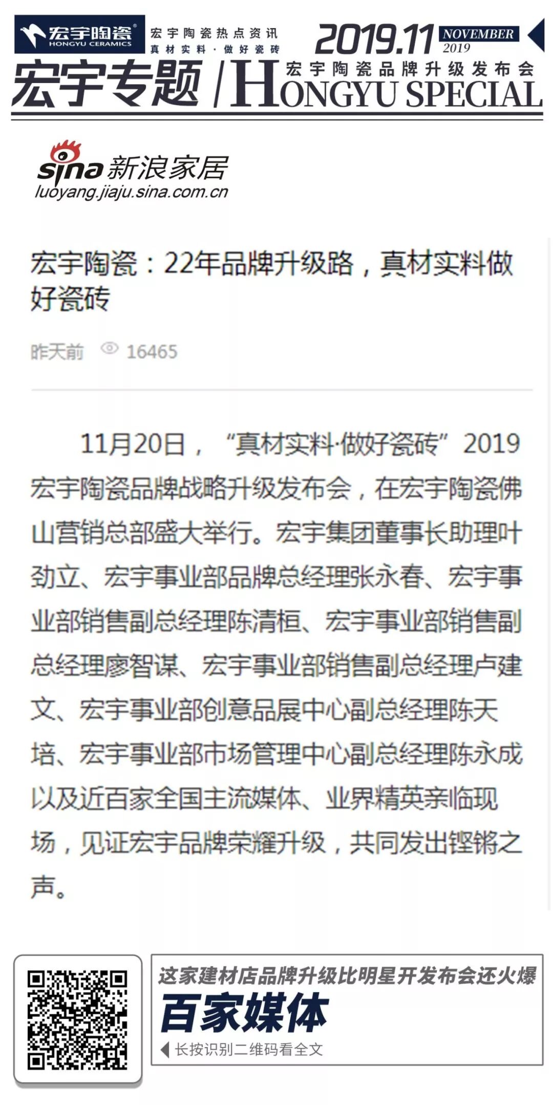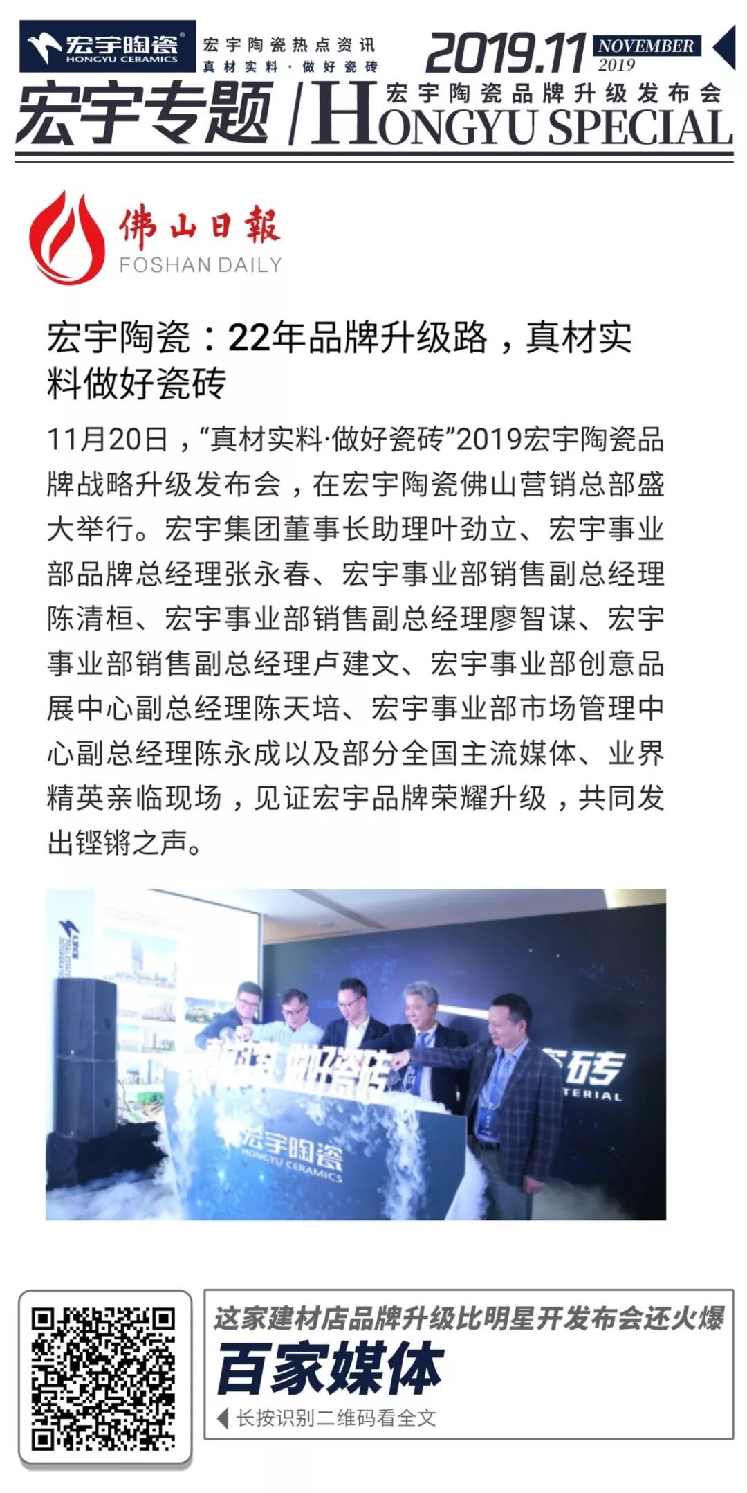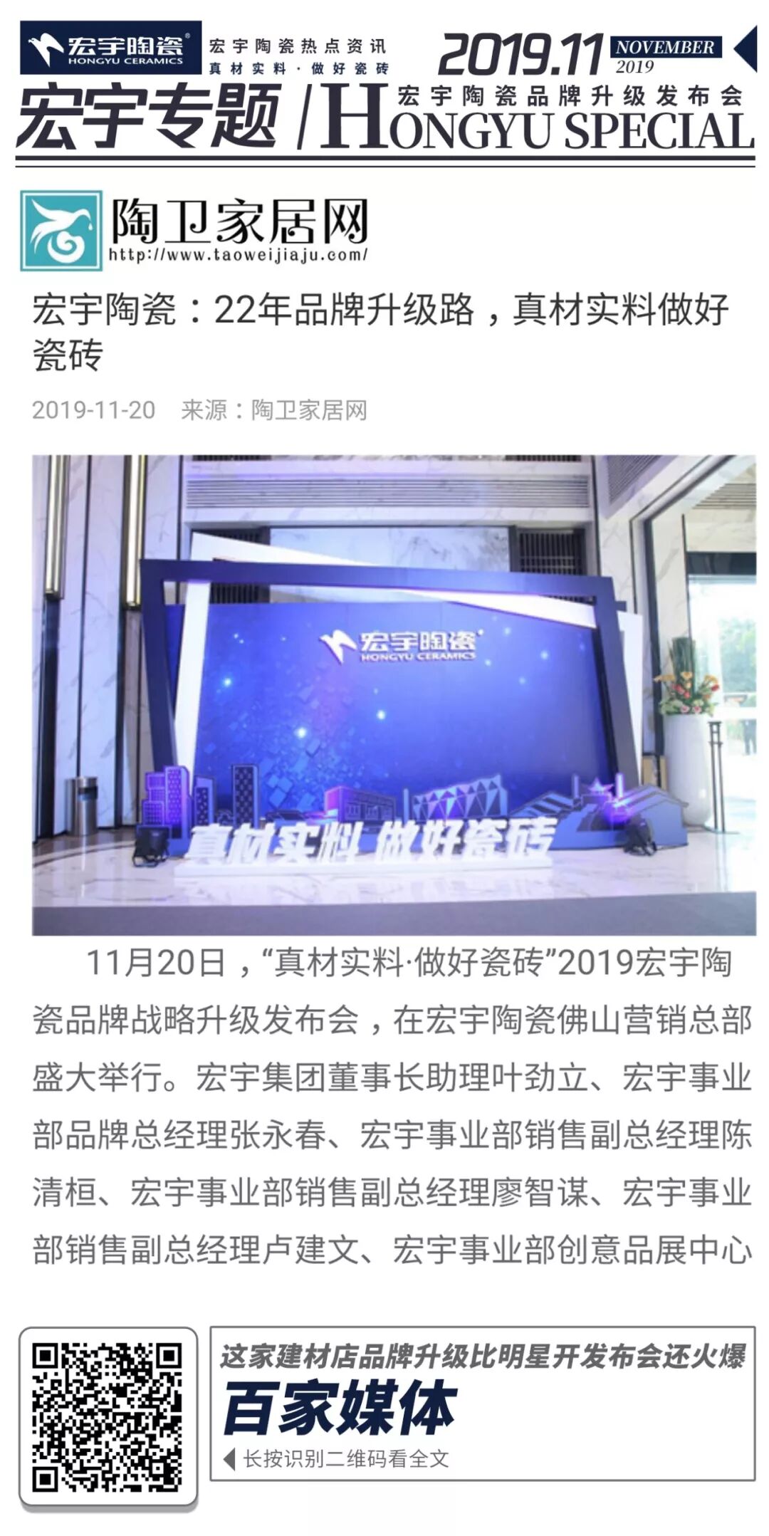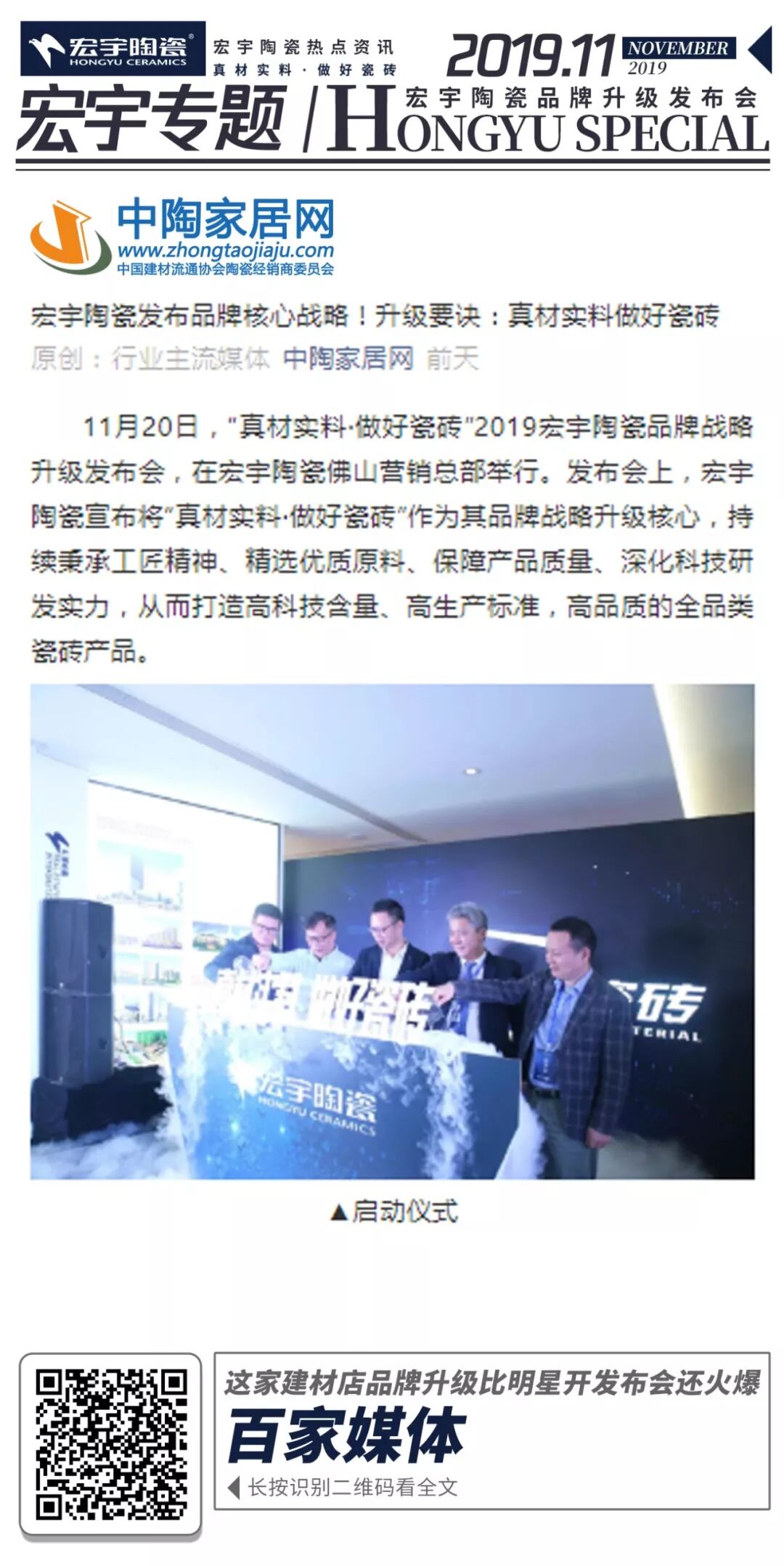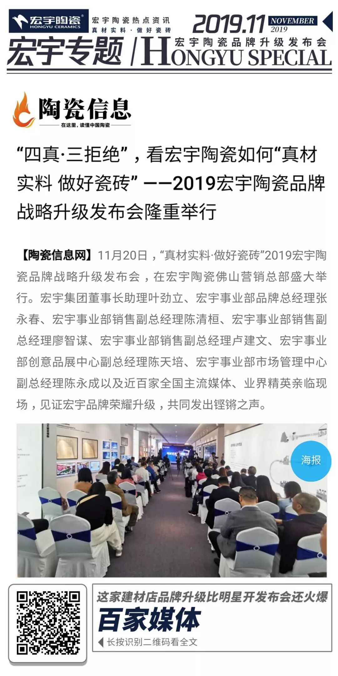 11月20日,“真材實料·做好瓷磚”2019宏宇陶瓷品牌戰略升級發布會在宏宇陶瓷佛山營銷總部盛大舉行。光明日報、中新社、新華網、經濟日報、人民網、中央廣播電視總臺央廣新媒體、國際商報、中國經濟導報、南方衛視、羊城晚報、香港大公報、南方網、新快報、信息時報、搜狐網等近百家重量級主流媒體及行業媒體到場,共同見證宏宇品牌榮耀升級。當天盛況迅速在業內刮起“宏宇旋風”,引發大量媒體爭相報道!