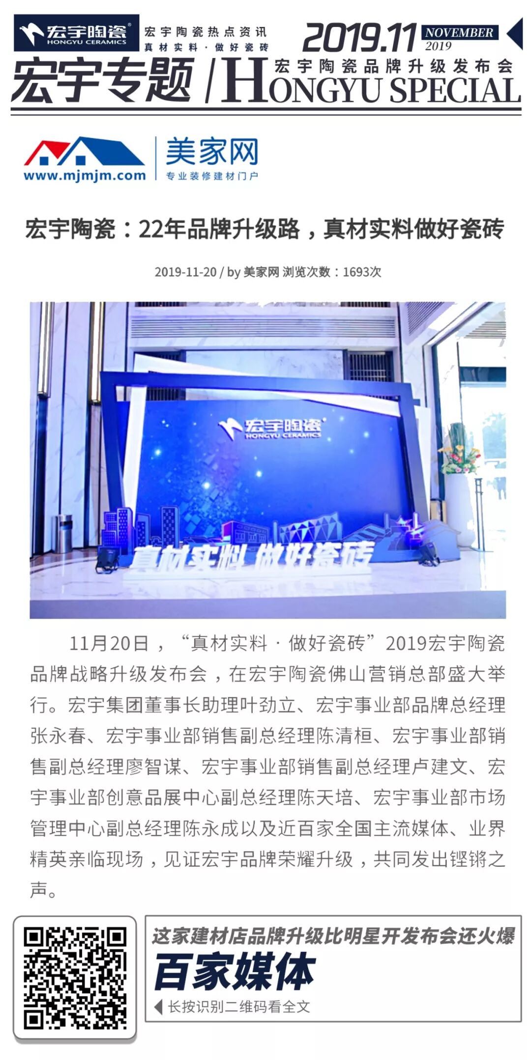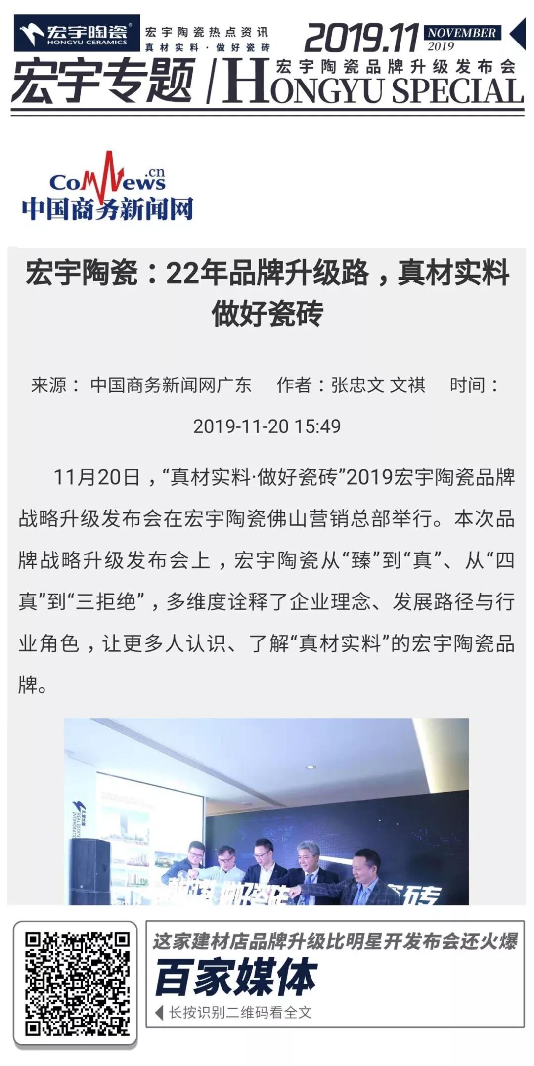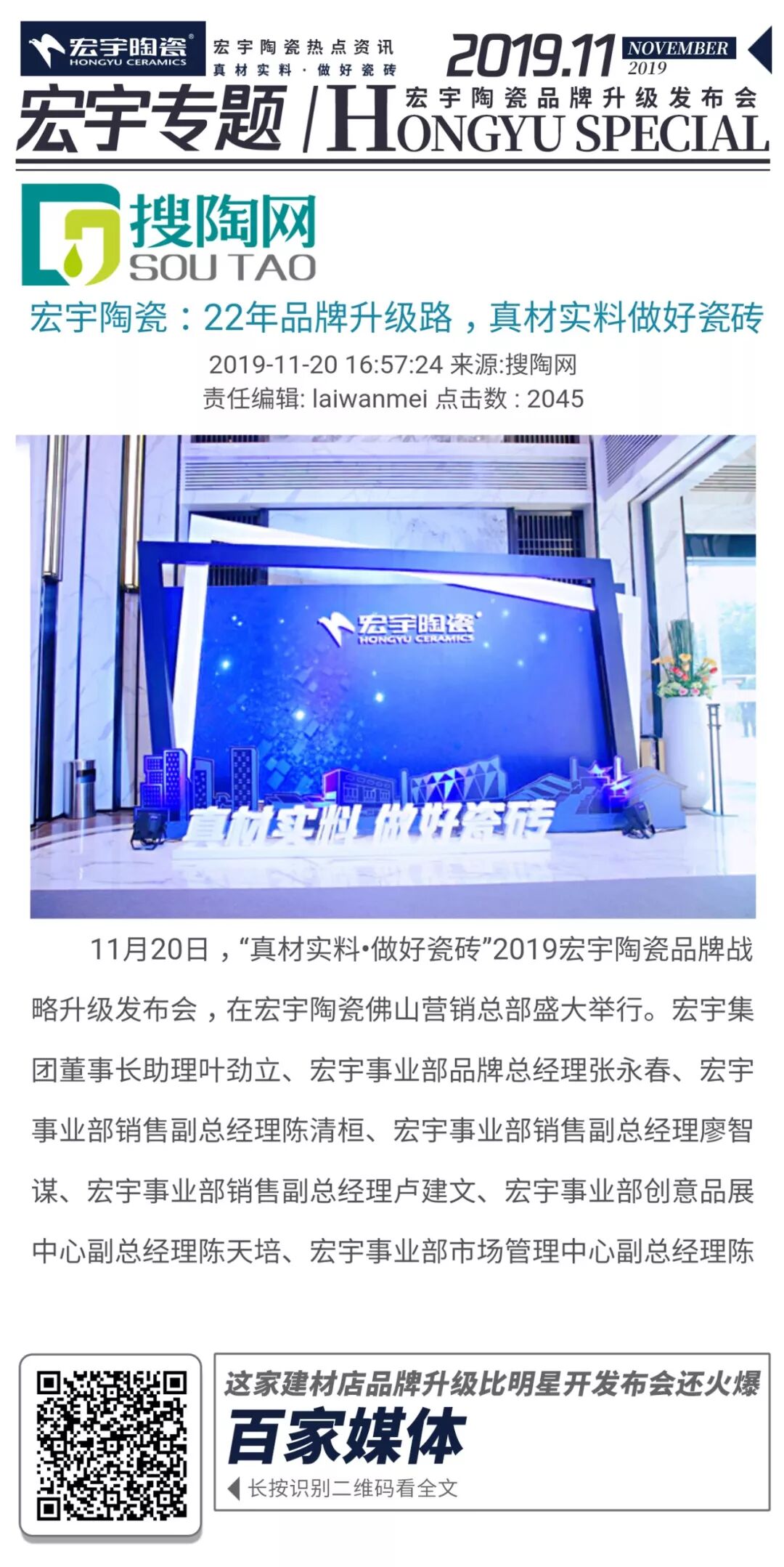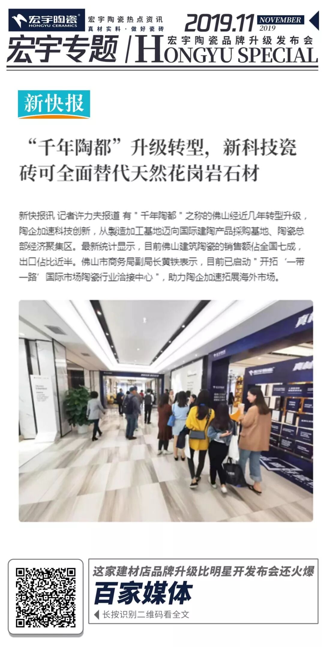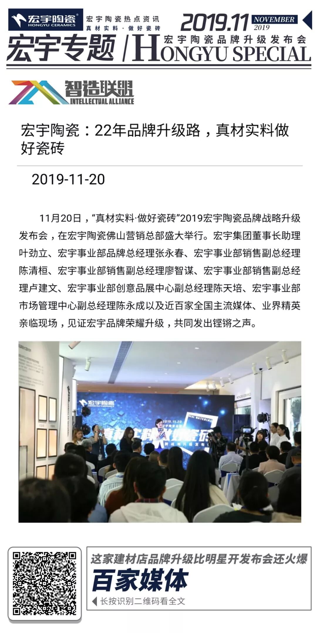 11月20日,“真材實料·做好瓷磚”2019宏宇陶瓷品牌戰略升級發布會在宏宇陶瓷佛山營銷總部盛大舉行。光明日報、中新社、新華網、經濟日報、人民網、中央廣播電視總臺央廣新媒體、國際商報、中國經濟導報、南方衛視、羊城晚報、香港大公報、南方網、新快報、信息時報、搜狐網等近百家重量級主流媒體及行業媒體到場,共同見證宏宇品牌榮耀升級。當天盛況迅速在業內刮起“宏宇旋風”,引發大量媒體爭相報道!