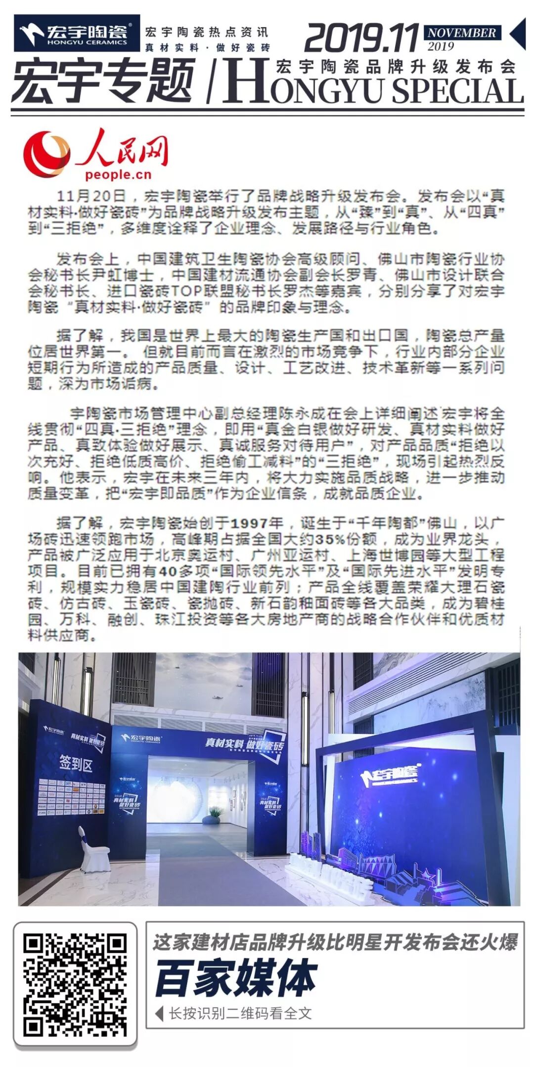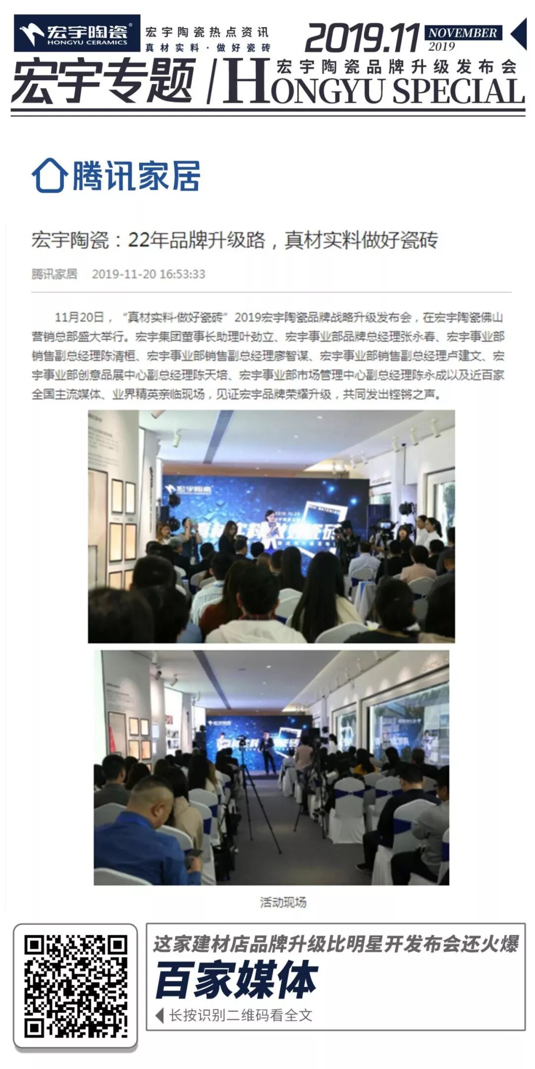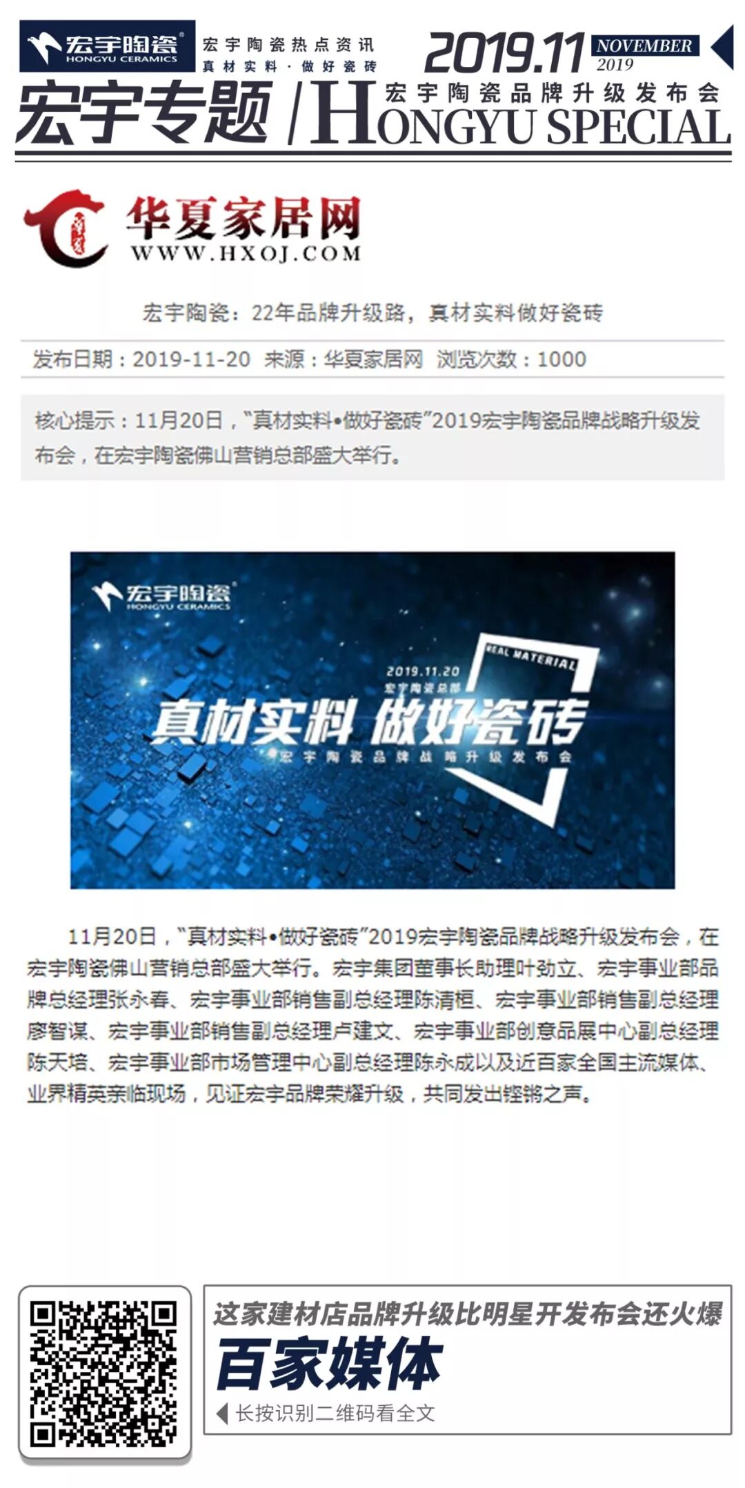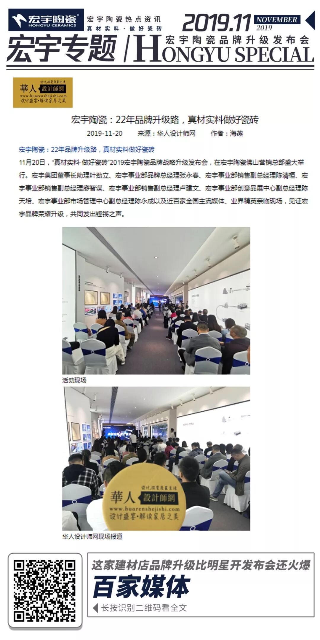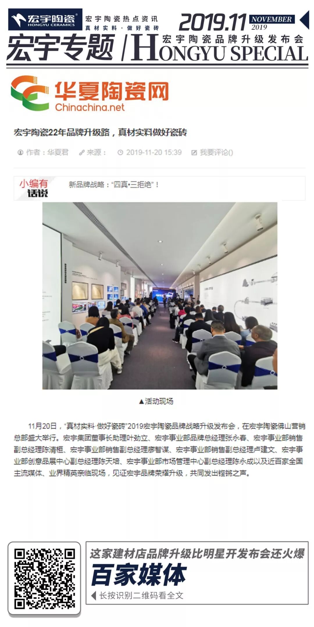 11月20日,“真材實料·做好瓷磚”2019宏宇陶瓷品牌戰略升級發布會在宏宇陶瓷佛山營銷總部盛大舉行。光明日報、中新社、新華網、經濟日報、人民網、中央廣播電視總臺央廣新媒體、國際商報、中國經濟導報、南方衛視、羊城晚報、香港大公報、南方網、新快報、信息時報、搜狐網等近百家重量級主流媒體及行業媒體到場,共同見證宏宇品牌榮耀升級。當天盛況迅速在業內刮起“宏宇旋風”,引發大量媒體爭相報道!