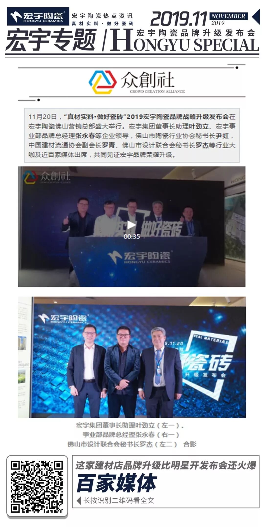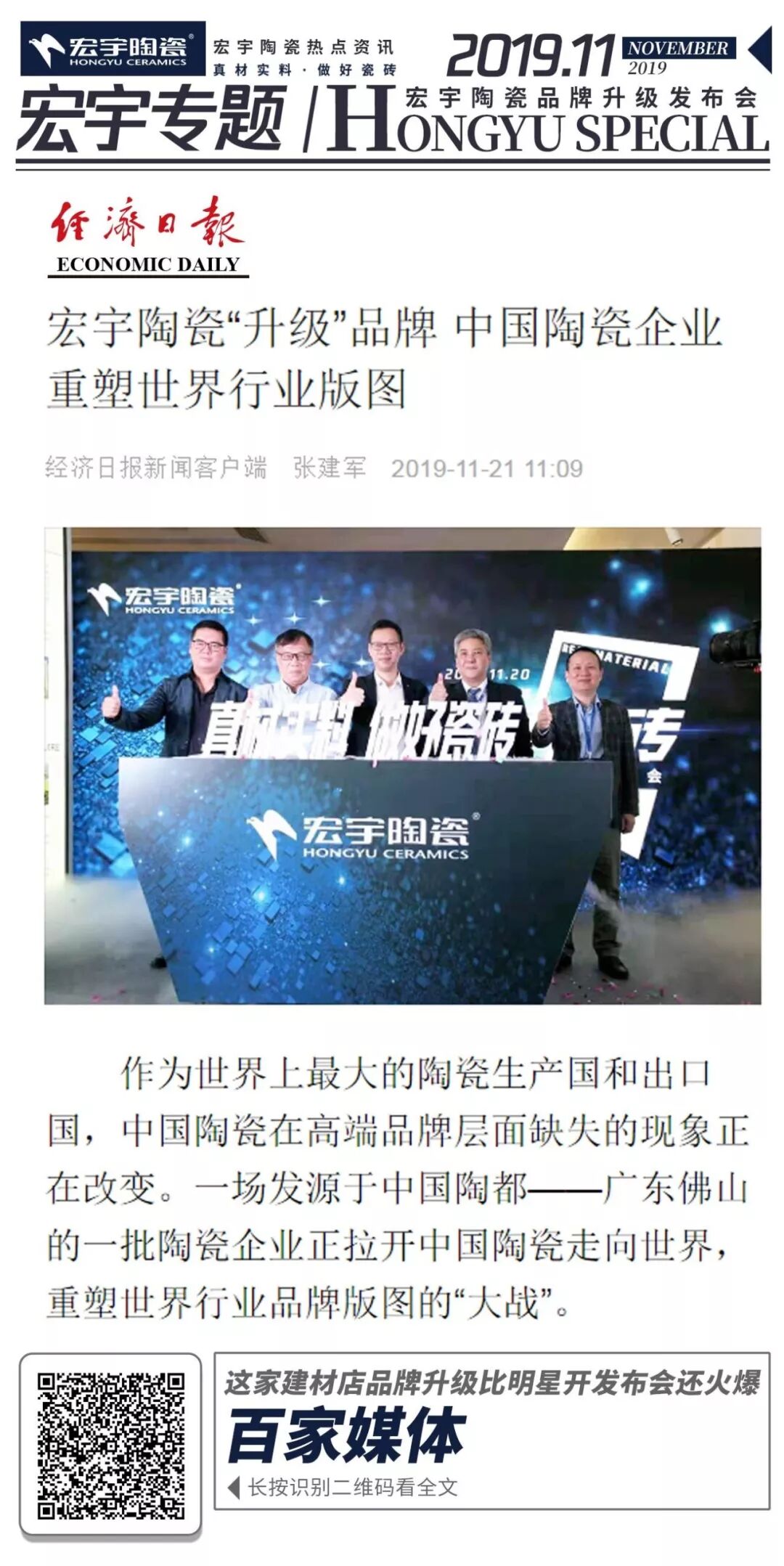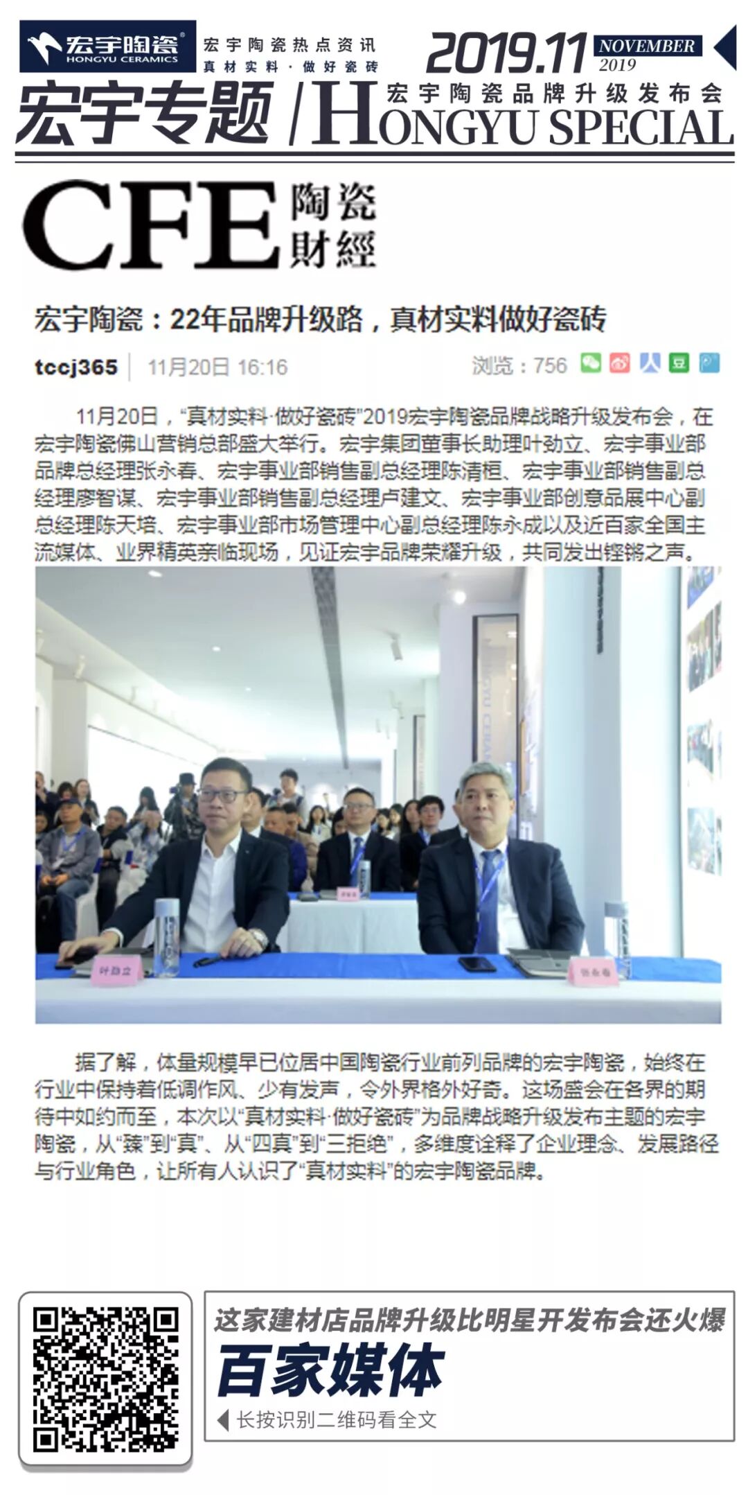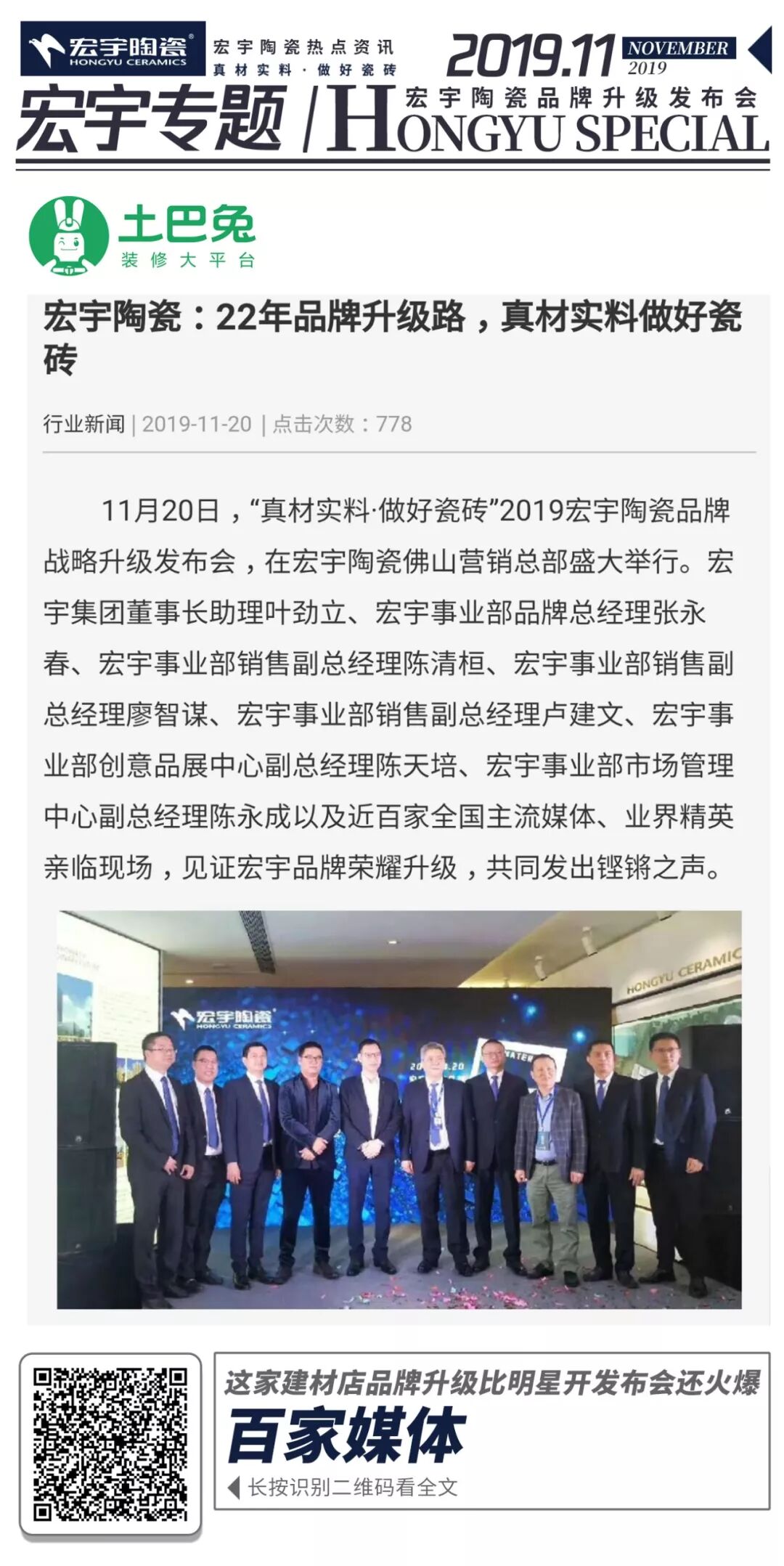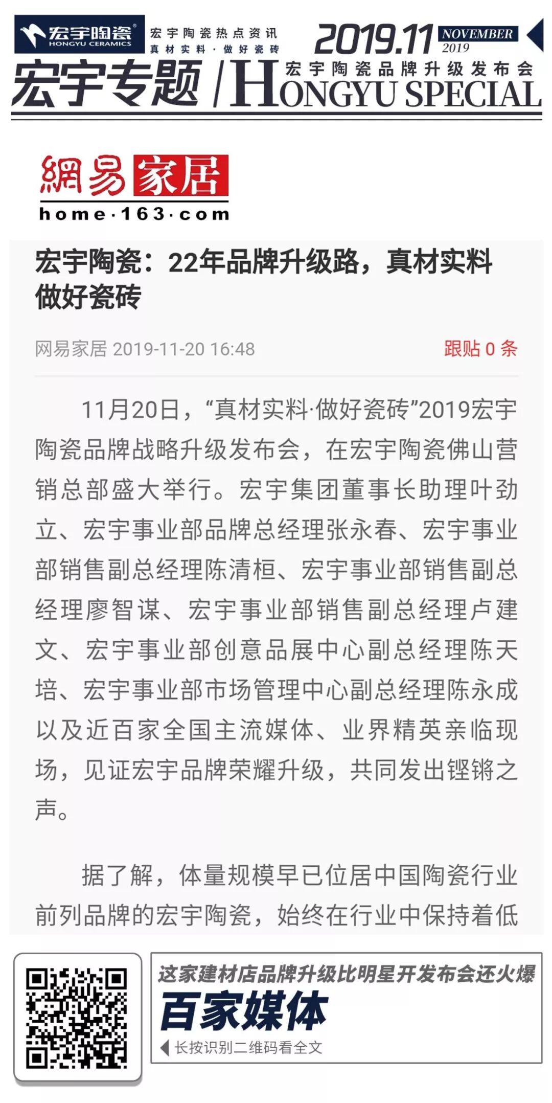 11月20日,“真材實料·做好瓷磚”2019宏宇陶瓷品牌戰略升級發布會在宏宇陶瓷佛山營銷總部盛大舉行。光明日報、中新社、新華網、經濟日報、人民網、中央廣播電視總臺央廣新媒體、國際商報、中國經濟導報、南方衛視、羊城晚報、香港大公報、南方網、新快報、信息時報、搜狐網等近百家重量級主流媒體及行業媒體到場,共同見證宏宇品牌榮耀升級。當天盛況迅速在業內刮起“宏宇旋風”,引發大量媒體爭相報道!