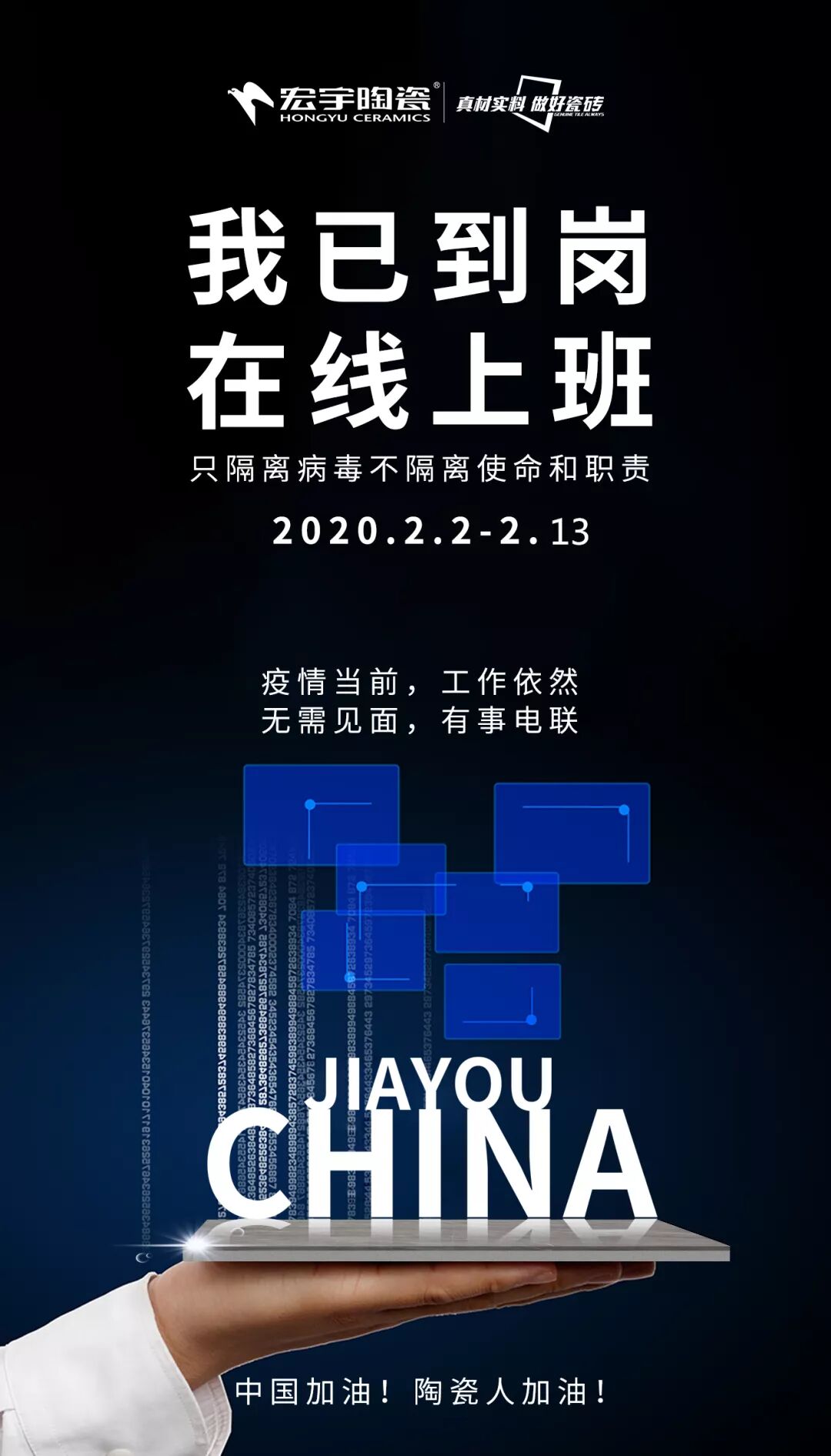 我已到崗,在線上班。線上聯系,不用見面。只要需要,我們就在。2月2日至13日,宏宇陶瓷全天在線服務不打烊,為各地經銷商及廣大客戶提供不間斷服務支持,在防控疫情期間停工不停服務,只隔離病毒不隔離工作與職責。