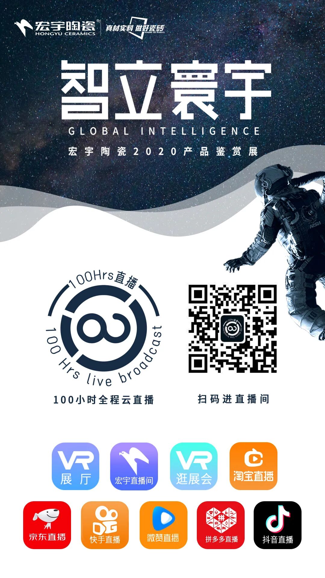 7月20日-24日,無論何時何地,只要打開手機,一鍵鏈接即可親臨宏宇陶瓷“智立寰宇”超1600平米大型概念館現場,無縫體驗“智造7+1”未來感工程奇觀。同時,通過技術合成、多維空間聯動,實現3D產品展示、數字展廳、VR虛擬實景演示等虛實結合的100小時全程云逛展體驗,帶來一場科技感十足的直播盛宴,與全球觀眾分享中國陶瓷的超級魅力。