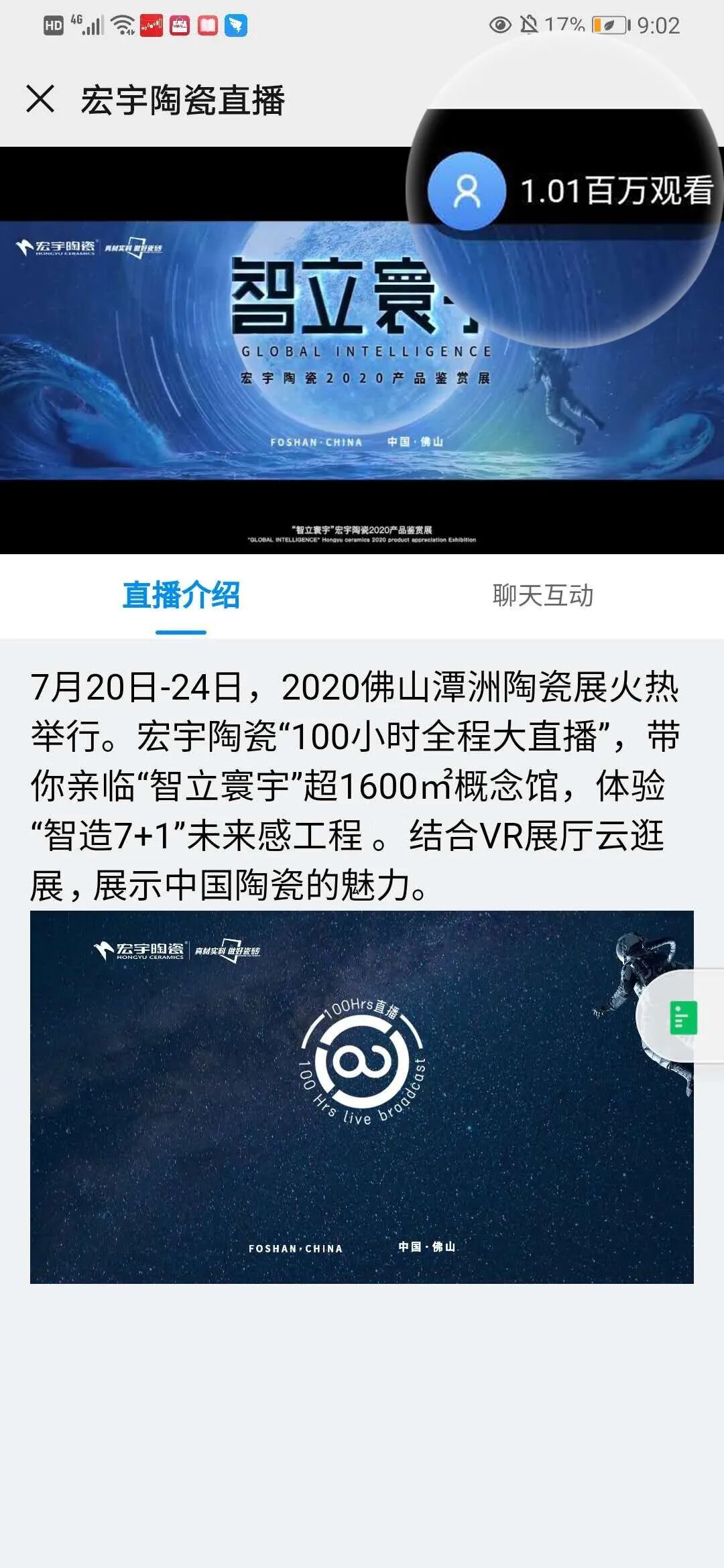 宏觀天下,宇量萬物。對于宏宇陶瓷而言,創新不只是材質、科技、工藝的單點升級,而是打破邊界,實現各個維度的交互與進化。連續4天的展會現場,宏宇陶瓷重磅開啟100小時不間斷云直播,佛山電臺知名主持人傾情出鏡,聯手宏宇陶瓷多位主播及嘉賓,全新互動玩法,實現線上線下的“雙展”融合體驗。